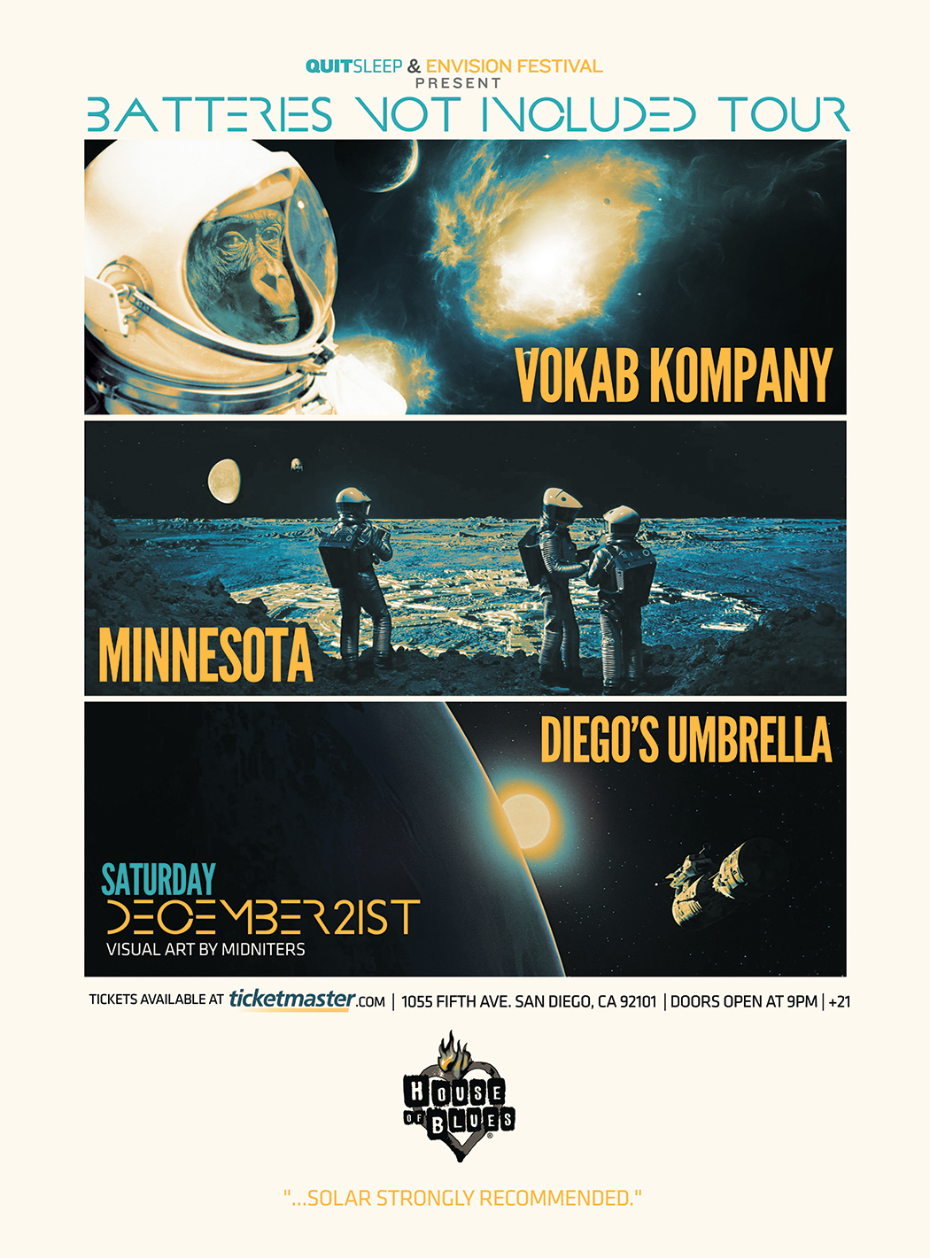 Vokab Kompany are two MC/singers from San Diego, backed by their 4 piece band of awesome. Their live show combines multiple synths/keys with bass/drums and a violin to create a sound that doesn't quite adhere to a specific genre, but seems to fit the bill with several. The band interprets Vk albums (which feature production from a multitude of universally acclaimed producers, such as; members of pop rock sensation Cage the Elephant, DubStep Phenom Stephan Jacobs, Hip Hop legends Hieroglyphics, downtempo legend Random Rab and the list continues across the spectrum of Electronic/pop and hip hop genres. Their new album, VKCE, a collaboration effort with up and coming production/ musician duo Crush Effect (featuring members of Funk/Jamband legend Karl Denson's TIny Universe) on "VKCE" filling a void at the intersection of the hip-hop and EDM worlds. ‘VKCE’ is Hip-hop, it’s electronic, it’s indie - it’s a shout out to the past, and a taste of the future. Vokab Kompany’s Matt Burke describes the experience: “As musicians, it’s an ever evolving world; genres are a thing of the past, so we (VK) were really lucky to have teamed up with producers that pushed the boundaries of our boxes. We got outside our comfort zone, stamped a VK next to CE, and the result was something new entirely.” The brazenly dynamic sound on VKCE has quickly garnered the attention of television and film. The record already has two national commercials, for a major carmaker (debuting 2013) and Southern Comfort. The album debuted at #47 on the iTunes hip-hop charts, behind only major-label releases from T.I. and Chief Keef among all hip-hop records released that week. The team has been blessed with a slew of great press. In addition to a feature on electronic music in the August print edition of SPIN, and "climbing" George Washington Bridge with Al Roker, the band has won best hip-hop group at the San Diego Music Awards for three years in a row, and even impressed Prince Charles when he stopped by Solana Beach's Belly Up to catch a VK show. |